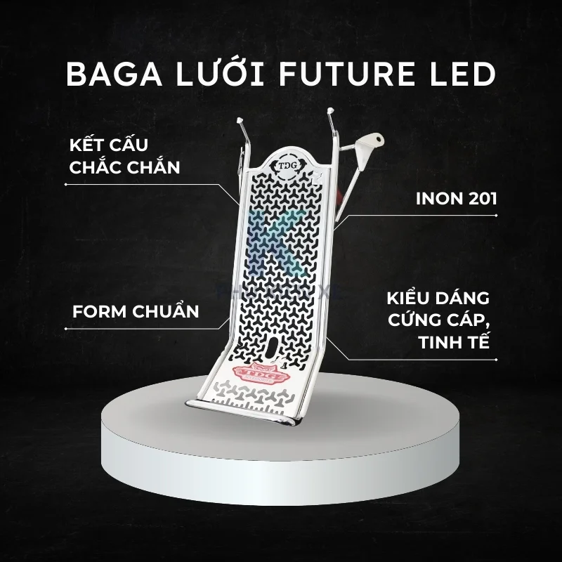 Là đơn vị trực tiếp sản xuất baga giữa cho nhiều dòng xe số, TDG hiểu rất rõ người chạy Future Led cần gì: baga phải chắc, dễ buộc đồ, không rung lắc và nhìn gắn lên phải hài hòa với tổng thể xe. Phiên bản baga lưới CNC này được hoàn thiện theo đúng tinh thần đó.